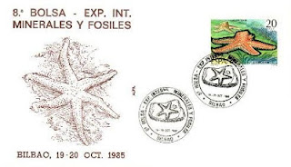 El matasellos especial, conmemorativo, de primer día de circulación, es de forma doblemente circular. Muestra en su centro una típica estrella de mar, con cinco brazos, sobre algo que parece un pedazo de piedra, como ya se ha dicho anteriormente, debe tratarse de algún género de asteroideo fósil y debajo la leyenda: 19-20 Oct. 1985. En la franja circular exterior, hay la leyenda: 8ª Bolsa-Exp. Int. Minerales y Fósiles. Bilbao,