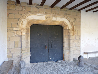 Izquierda: detalle de la decoración del pavimento, en los escalones situados tras la puerta que figura en la imagen precedente, reproduciendo el motivo básico, de círculos concéntricos que predomina en todo el empedrado de los dos accesos principales.