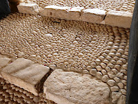 Derecha: aspecto de una amplia zona pavimentada con "coronetas", en uno de los dos accesos principales que conducen hasta la puerta principal del templo. Se pueden apreciar las sencillas figuras geométricas, conseguidas, mediante la disposición de las coronetas, siguiendo un sencillo patrón, repetido como motivo decorativo de la pavimentación.