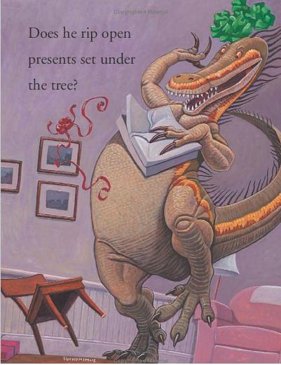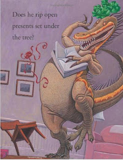 Imagen realizada por el ilustrador, norteamericano, Mark Teague utilizada para la cubierta del libro How Do Dinosaurs Say Merry Christmas?, cuyos autores son, él mismo, como ilustrador, y la veterana escritora, norteamericana, Jane Yolen, como autora de los textos.