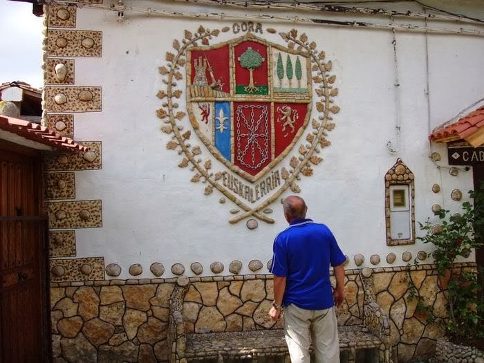 Elementos decorativos y expresivos que por efecto del ángulo de la toma fotográfica, resultan difíciles de interpretar. El mayor es un escudo, no identificado, situado entre dos rótulos que, tal vez pudieran estar escritos en euskara. Todo ello está situado en una de las fachadas laterales de la casa. Personalmente, me descubro ante la paciencia y trabajo duro de esta artística obra tan magnifica, no hay que quitarle su merito de obra artística. Si bien es cierto que no comparto el uso de los fósiles para este menester puesto que no me parece apropiado el uso de este material para adornar la casa.