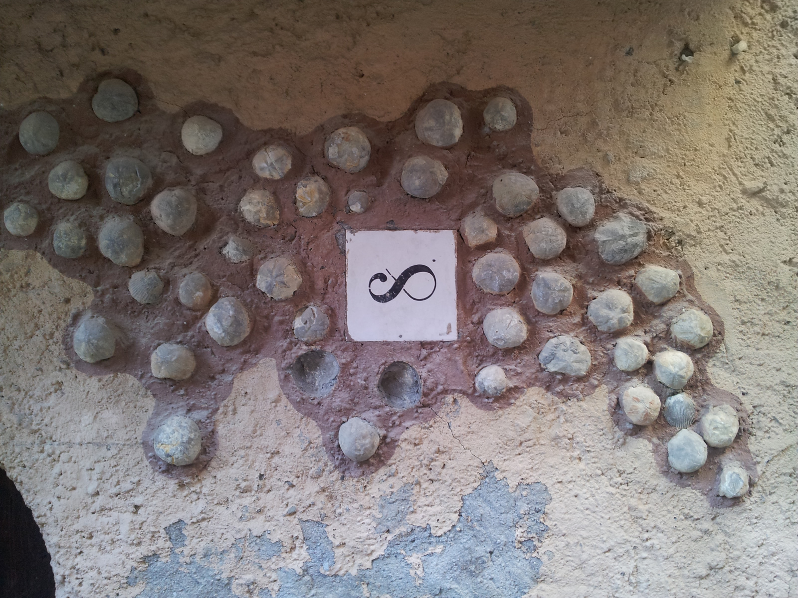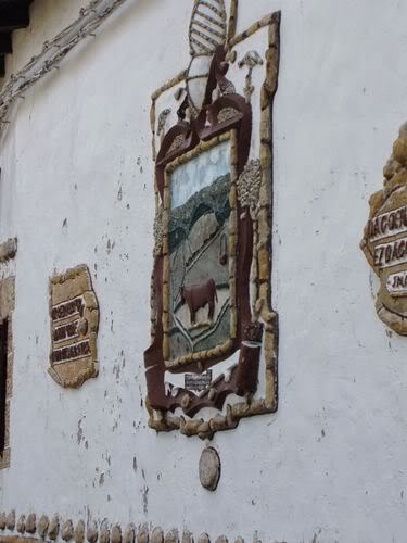 Parte derecha del muro de la fachada principal, en la que se pueden ver dos rótulos, elaborados con fósiles, que expresan, suponemos, dos principios morales seguidos por el constructor y propietario... o tal vez dos recomendaciones sugeridas al visitante...
